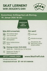 Ab Montag, 19. Januar 2026 starten wir beim SkatTreff Eppendorf e.V. einen kostenlosen Skat-Anfängerkurs – ohne Druck, aber mit Plan.