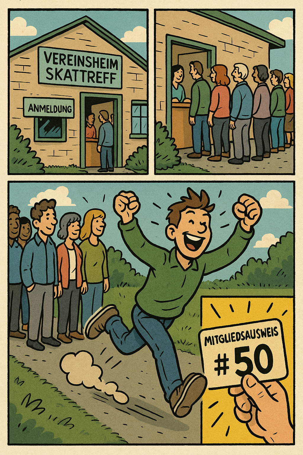 Comic zum 50. Mitglied: lange Schlange vor der Anmeldung, jemand rennt jubelnd mit Mitgliedsausweis #50 heraus.